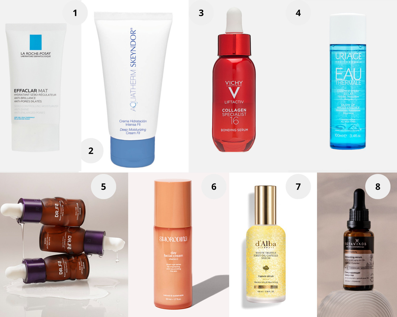 1. Матирующий крем Effaclar MAT+, La Roche-Posay. 2. Увлажняющий крем из новой линии Aquatherm, Skeyndor. 3. Сыворотка Liftactiv Collagen Specialist 16, Vichy. 4. Увлажняющая эссенция придающая сияние коже О’Термаль, Uriage. 5. Дневная лифтинг-сыворотка с бакучиолом, DR.F5. 6. Антивозрастной дневной крем с витамином С в липосомах, SMORODINA. 7. Сыворотка для лица White Truffle First Oil Capsule Serum, d’Alba. 8. Стимулирующая сыворотка для нормальной и зрелой кожи Tone & Elasticity, Botavikos.