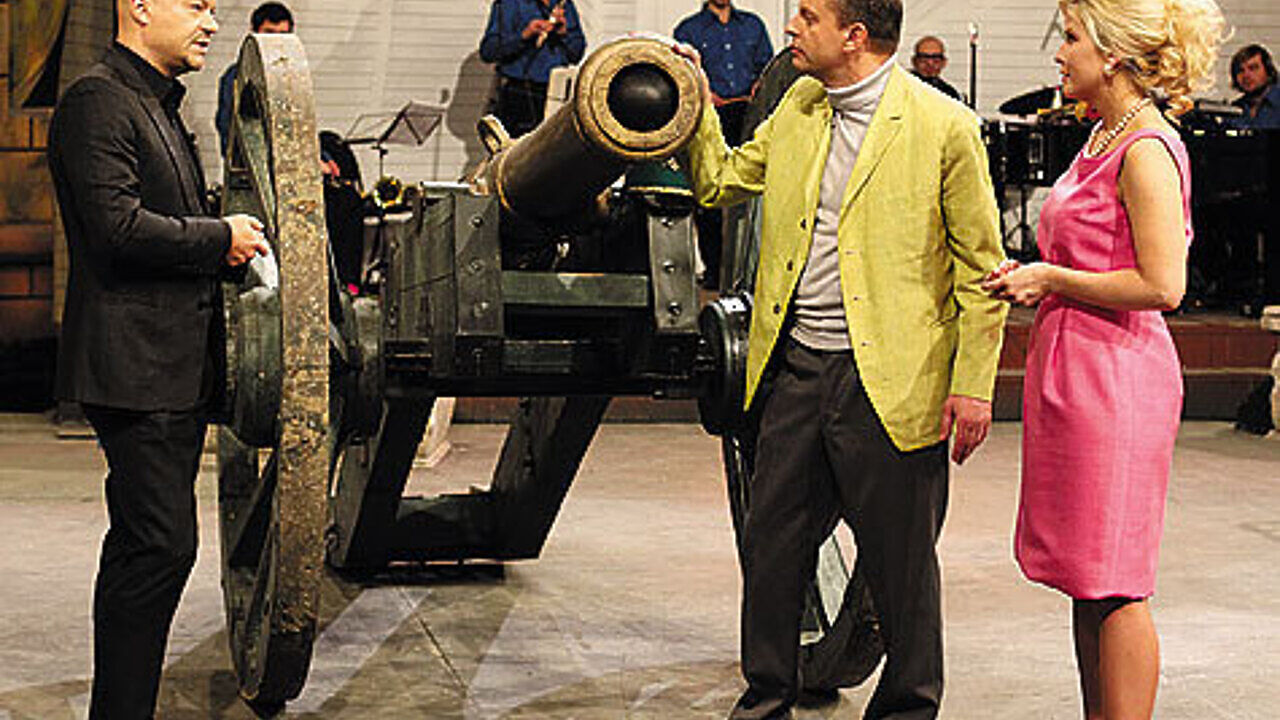 Декорации — это то, что поражает в первую очередь. Одна из студий «Останкино» превратилась в старый московский дворик — с эстрадой, лавочками, березками, арками, в которые въезжают автомобили, и людьми в костюмах эпохи, которая, казалось, была еще вчера. Дворик — внутри огромного сталинского дома. Декораторы хотели остановиться на двух этажах и снимать только на высоте первого, но в итоге получилось три, причем в натуральную величину. То, что они из поролона и пенопласта, не сразу поймешь, даже находясь в студии. В окнах висят настоящие шторы и люстры, за некоторыми из них — обставленные такой же настоящей мебелью квартиры и даже балкон, на который при желании могут выйти ведущие Леонид Парфенов и Татьяна Арно.