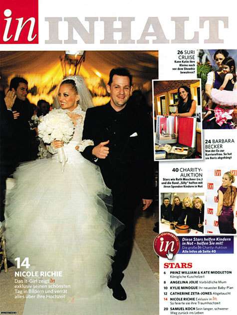 В прошлую субботу Николь Ричи вышла замуж за своего давнего бойфренда и отца двух ее детей Джоэла Мэддена. Церемония состоялась в узком кругу близких и друзей в доме отца невесты, знаменитого музыканта Лайонела Ричи. В интервью немецкому журналу In, опубликовавшему фотографии с бракосочетания, Николь рассказала, что ее свадебный наряд был от Marchesa. Его дизайн был навеян платьем Грейс Келли, в котором она выходила замуж за принца Монако Ренье. А главным сюрпризом для 30 приглашенных на бракосочетание гостей стал живой слон — любимое животное Николь, которое доставило немалую радость также ее двухлетней дочери Харлоу и 15-месячному сыну Спэрроу. Однако выбор экзотического зверя в качестве живой игрушки возмутил защитников животных, которые вместо поздравлений послали молодоженам гневное письмо.