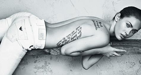 Новые рекламные постеры Меган Фокс для Armani продолжают радовать глаз ее поклонников. А последний плакат так и вовсе стал предметом для детального изучения. А все потому, что актриса на снимке показала свои татуировки, которые она обычно скрывает. Надпись на плече Меган гласит: «Мы будем все смеяться над позолоченными бабочками» — это цитата из Шекспира. А татуировка на боку посвящена Микки Рурку: «Те, кто танцевал, казались безумцами тому, кто не мог услышать музыку». Что покажет Фокс во время следующей фотосессии — остается только гадать.