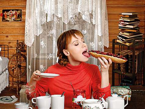 Юлии Савичевой достался самый «вкусный» кадр. Но поскольку снимали мы достаточно долго, то фотосессия превратилась для Юли в сплошное испытание: вот вроде бы совсем рядом этот свежайший кусок булки и домашнее варенье, но попробовать все это великолепие нет никакой возможности. Зато когда фотограф наконец-то сказал заветное: «Стоп, снято!» — мы не устояли и устроили скромное чаепитие.