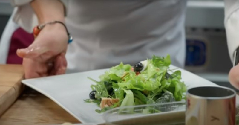 По словам Алекса: «Лист салата просто рвем на куски, добавим перепелиные яйца, пару помидорчиков черри, тунец, чуть-чуть оливок, перчим, базилик, заправляем оливковым маслом (можно любым). Перемешиваем прямо руками. И вываливаем на блюдо!»