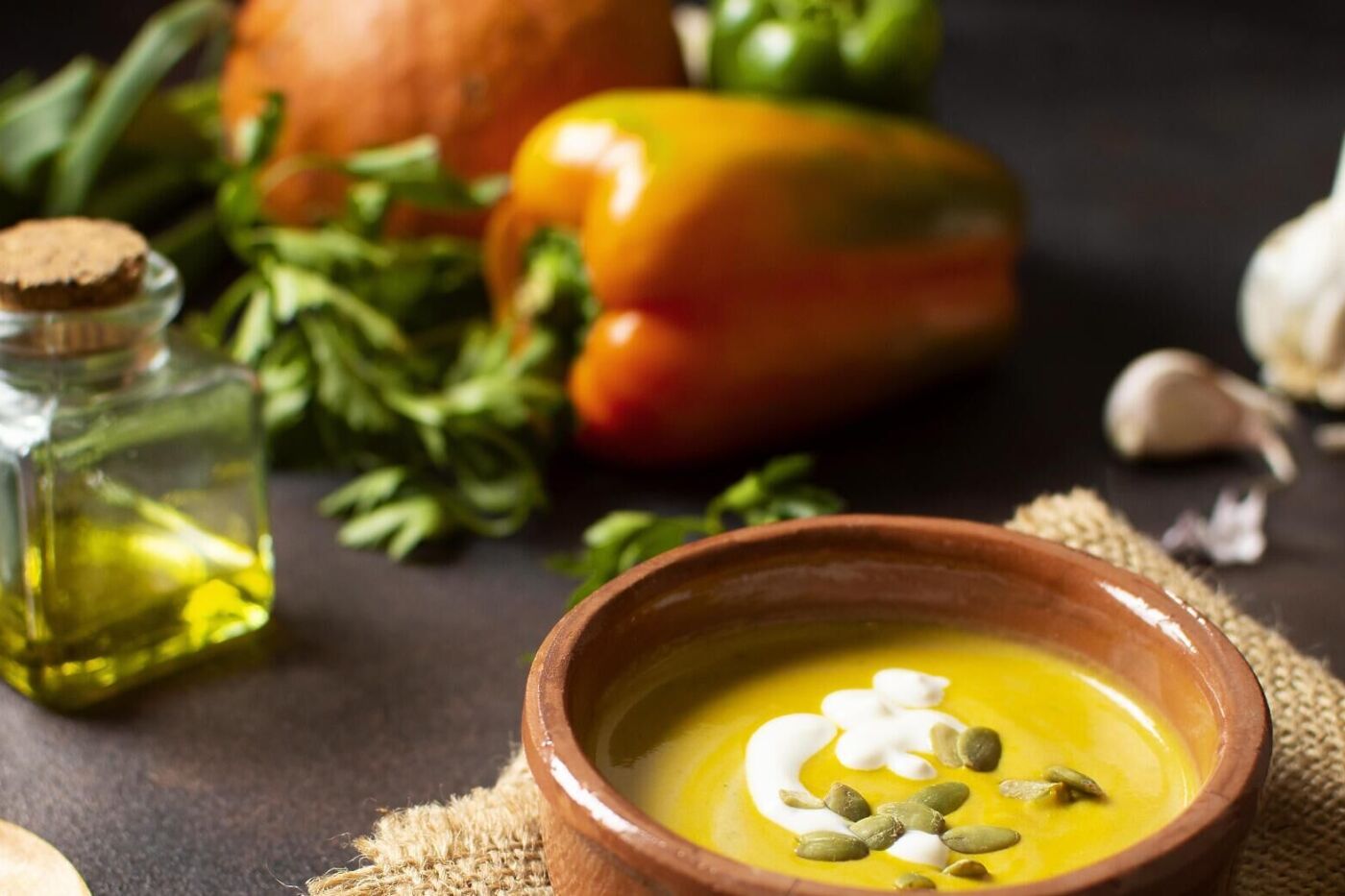Очистите овощи, морковь и картофель отварите, а кабачки можно немного обжарить вместе с луком и чесноком. Сложите овощи в миску или удобную вам емкость и залейте водой. Измельчите овощи блендером, постепенно вливая теплые сливки. Доведите массу до пюре, добавьте соль и перец.