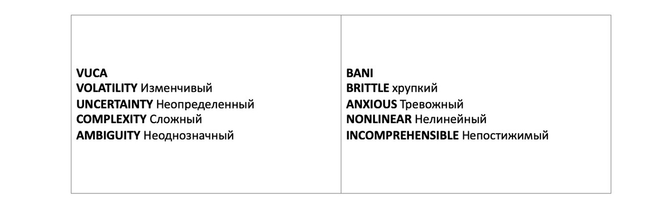 Социологи объясняют это глобальным переходом из мира VUCA к миру BANI. Эти буквы (см. таблицу) и расшифровывают социальные тренды.