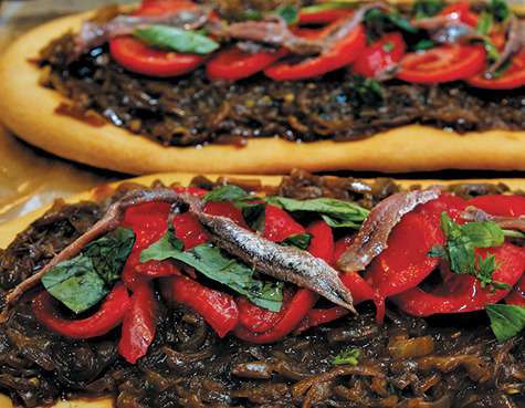 Вам потребуется: 1 кг лука, 300 г муки «Makfa», 30 г свежих дрожжей, 90 г сливочного масла, 2—3 крупных помидора, 2 яйца, 10 анчоусов, 4 зубчика чеснока, 2 ст. ложки бальзамического уксуса, 1 ст. ложка сахара и щепотка сахара, 1 ст. ложка солодового сиропа или меда, пучок базилика, оливковое масло, по щепотке морской соли и сахара.