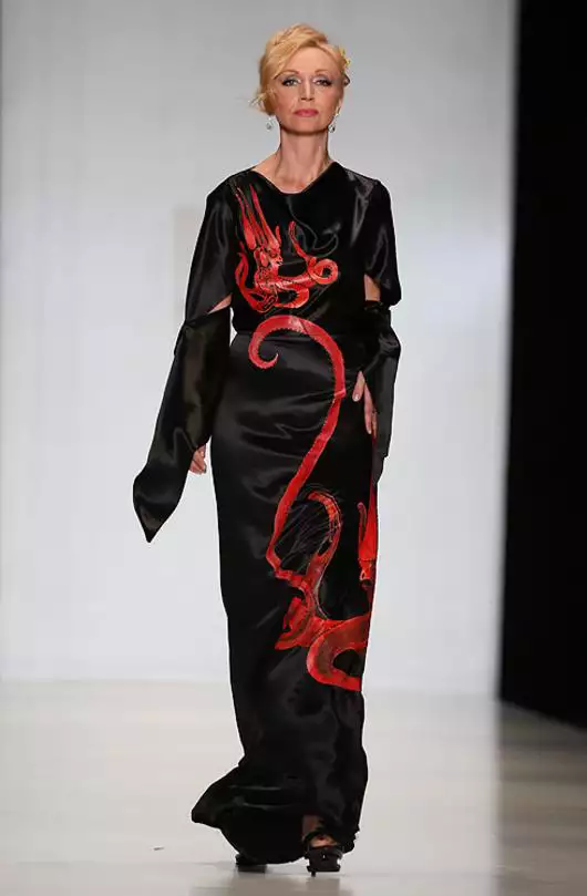 Питерский художник Татьяна Парфенова не стала увлекаться звездностью. Ее коллекция — мода Царскогор села на новый лад. В ней удивительным образом переплетаются мифы имперского Рима и русские народные сказки, платья-туники и платья-колокольчики, шелк и хлопок, плетеный шнур и вышивка гладью. Носить такие одежи, сдобренные головными уборами, напоминающими то ли охапку колосьев, то ли корону из перьев, в повседневной совсем не обязательно.