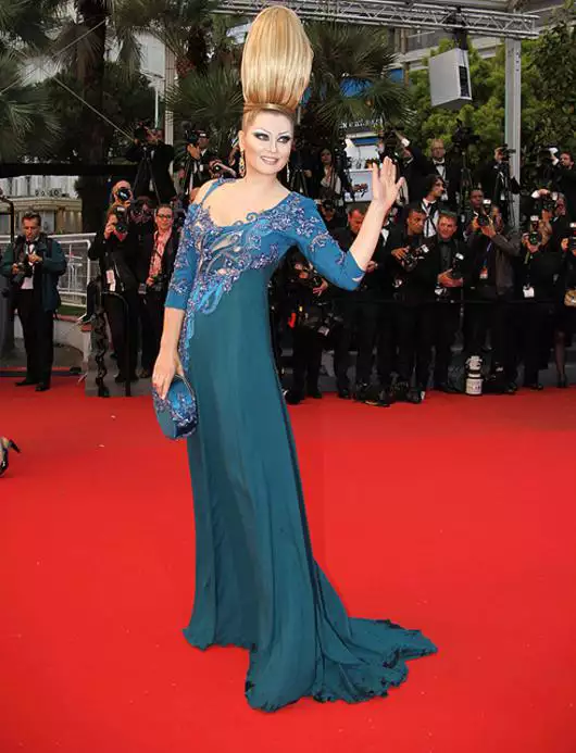 В 2013 году на Каннском кинофестивале французский журнал Gala выдал мне пальмовую ветвь за эту «Самую невероятную прическу Каннского кинофестиваля» (Gala, 19 mai 2013). В этом дынеобразном сооружении было спрятано резиновое изделие № 1, которое позволило сделать эту прическу легкой в ношении и вызвать волну обсуждений в прессе. Аквамариновое платье российского модельера Виктории Чертиной из чистого шелка, расшитое стразами, пайетками, блестками и вышивкой, даже потерялось на фоне прически. Надо сказать, что в Канны я всегда ношу платья только российских модельеров и считаю это самым моим патриотичным вкладом в имидж России. Несколько тысяч фотографов, аккредитованных на Каннскую лестницу со всего мира, истошно скандировали мое имя, и я волновалась, не надорвутся ли они.