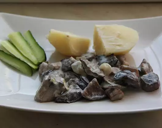 Грибы почистить, промыть холодной водой и нарезать небольшими кусочками, положить в кастрюлю с холодной водой, посолить и довести до кипения вместе с одной целой очищенной луковицей. Проварить грибы 5 минут. Если луковица изменит цвет на синий или красный, то считается, что такие грибы могут быть небезопасными, лучше от них отказаться. Затем воду слить и обсушить грибы в дуршлаге. На сковороде разогреть масло и добавить мелко нарезанный лук, обжарить его до прозрачности, добавить грибы и тушить около 30 минут на слабом огне под крышкой. Затем добавить сметану, посолить и тушить еще 5 минут.