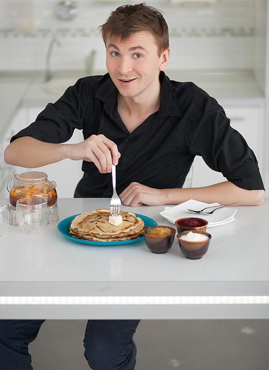— Два года я жил в Америке. Учился в Нью-Йорке в театральном институте Lee Strasberg Theatre and Film Institut, работал в одном из Бродвейских театров. Друзья, однокурсники и коллеги были со всех уголков света, поэтому мы дружно отмечали разные национальные праздники, и Масленицу в том числе. Ответственная миссия жарить блины всегда лежала на мне, а ингредиенты покупались в русском магазине на Брайтон Бич. Делалась высокая гора тонких блинчиков, а на стол ставили разные начинки: сметана, мед, сыр, красная рыба и так далее. И каждый мог сделать блин на свой вкус. Я хотел бы с вами поделиться рецептом блинов.