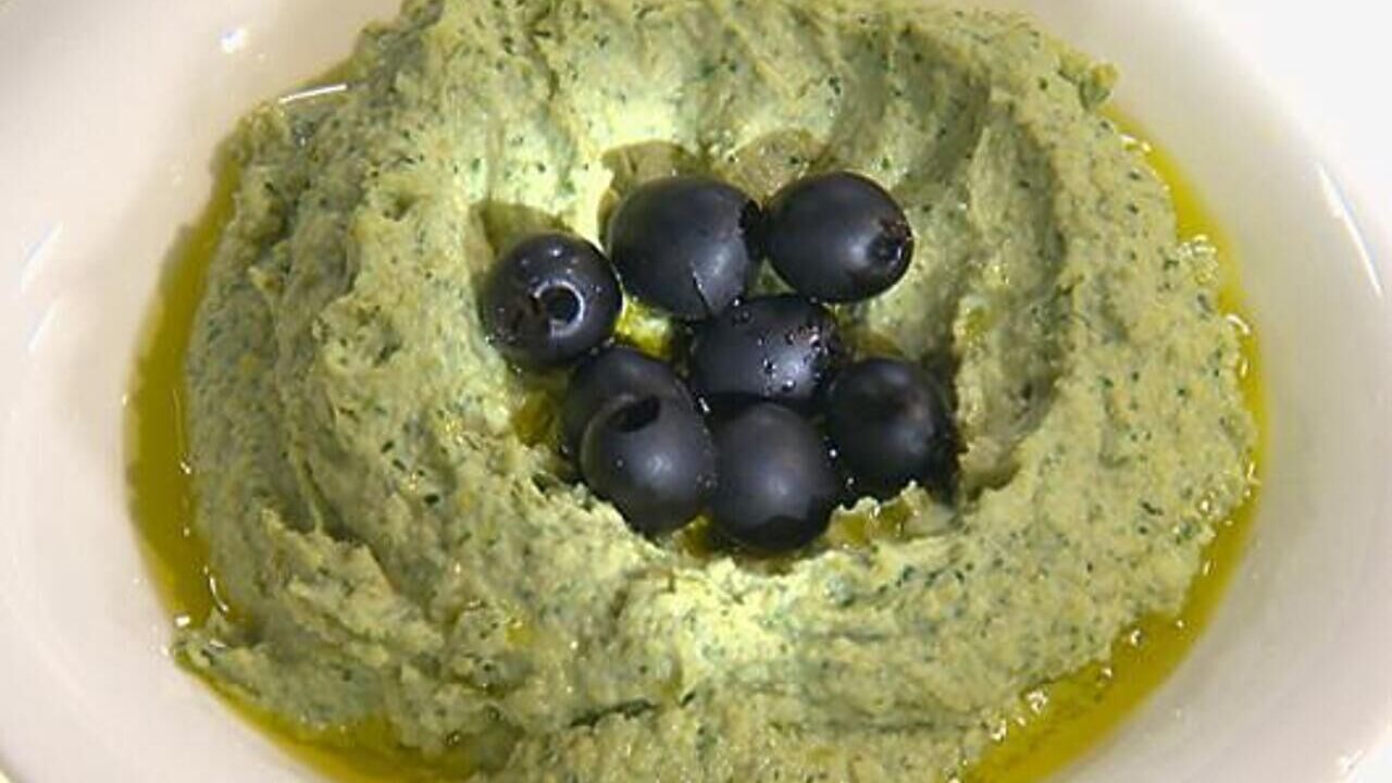Горох нут отварить, остудить и очистить каждую горошину от шелухи. Затем смешать нут в блендере с лимонным соком, шпинатом, молотой корицей, сыром фета и оливковым маслом. Хорошенько измельчить. Подавать в качестве закуски, например, с гренками.