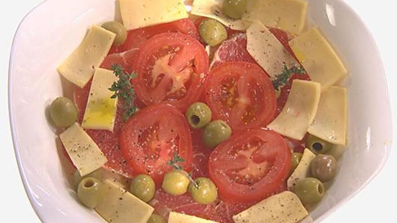Тонко нарезать грейпфрут и очистить его от пленок. Выложить на широкое блюдо. Сверху расположить слой тонко нарезанных помидоров, затем кубики сыра, потом снова грейпфруты. Увенчать композицию половинками оливок без косточек. Сдобрить салат оливковым маслом и черным перцем. Оригинальная закуска готова!