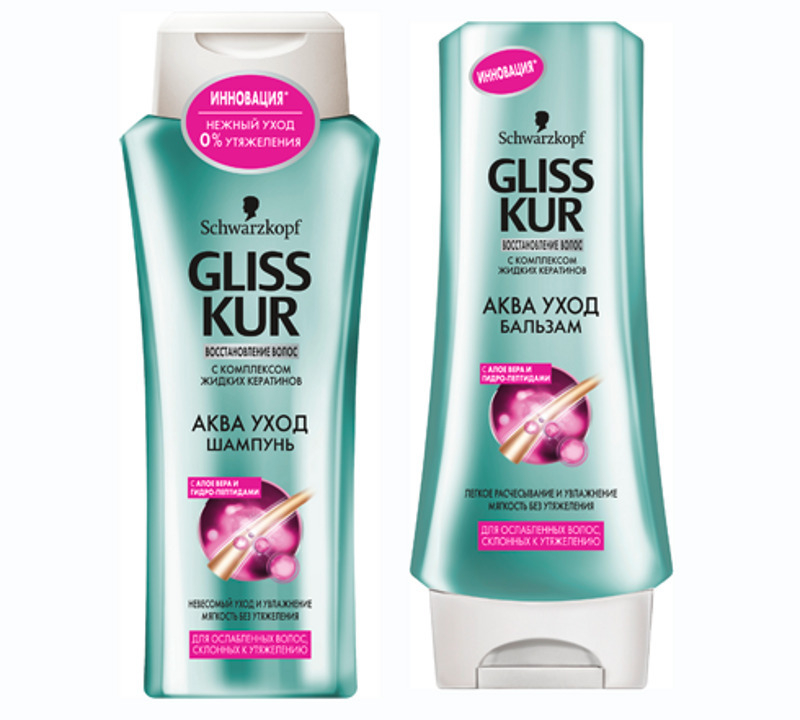 Gliss Kur предлагает в качестве «скорой помощи» серию средств для восстановления волос без утяжеления Аква Уход с комплексом жидких кератинов, Алоэ Вера и Гидропептидами.
