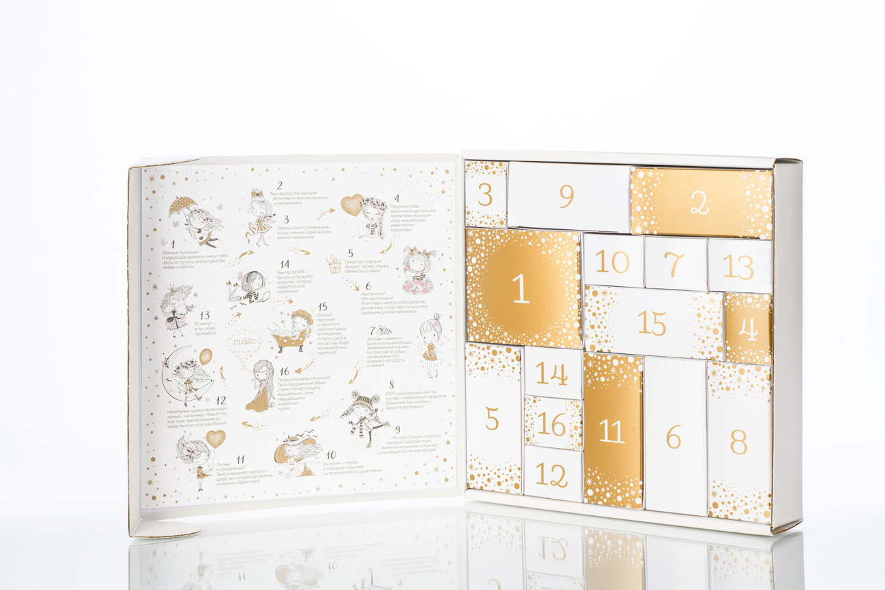 Адвент-календарь mi&ko «Мечтай, улыбайся, люби!» скрывает 16 натуральных средств для лица, тела и волос помогут встретить Новый год во всеоружии и наслаждаться своей красотой еще долгое время после него. Среди средств — пена для ванн Pink Dreams с ароматом вечерней неги Pure Beauty, шампунь и кондиционер для волос Extreme Repair, маска для лица Экспресс-Уход, тонер для сияния кожи White Magic и еще множество волшебных баночек.