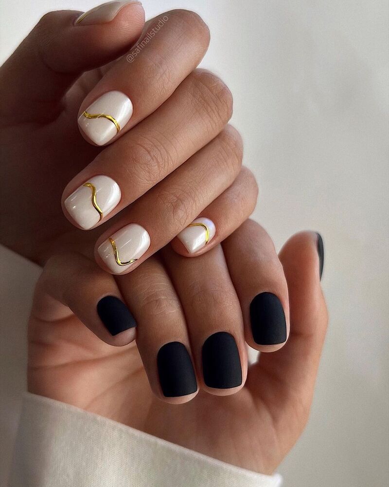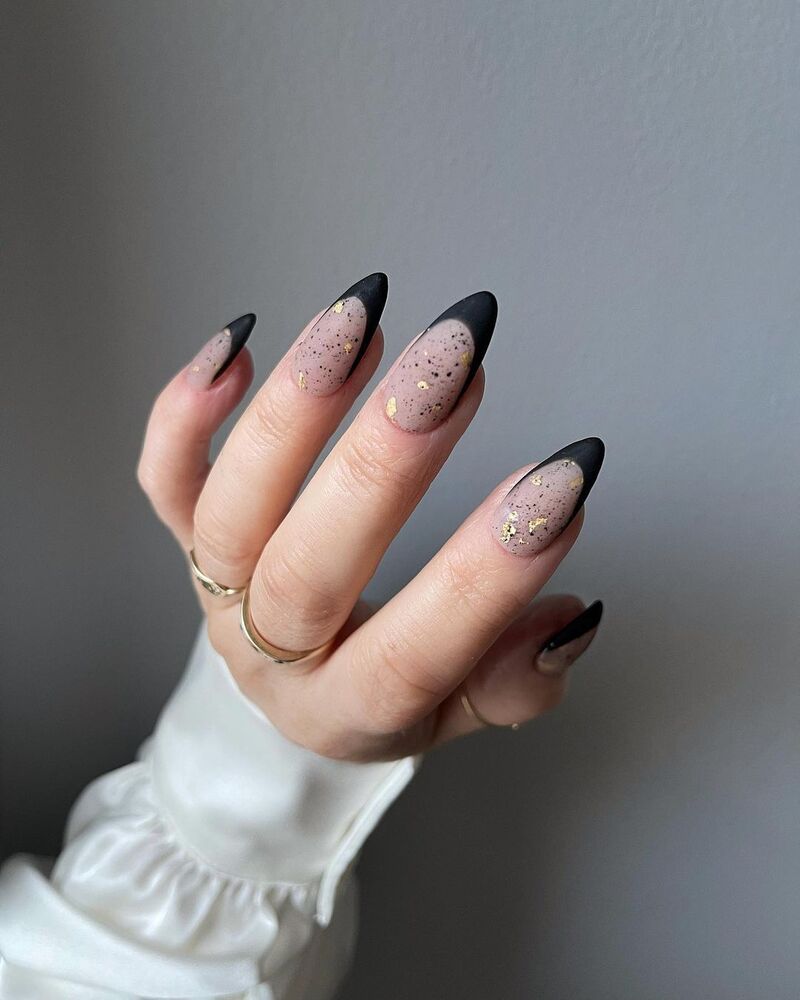 Немного готической стилистики. Черная линия улыбки плюс золотые блестки на нейтральном фоне. Это элегантный маникюр в стиле новой классики. Дополнит любой вечерний образ.