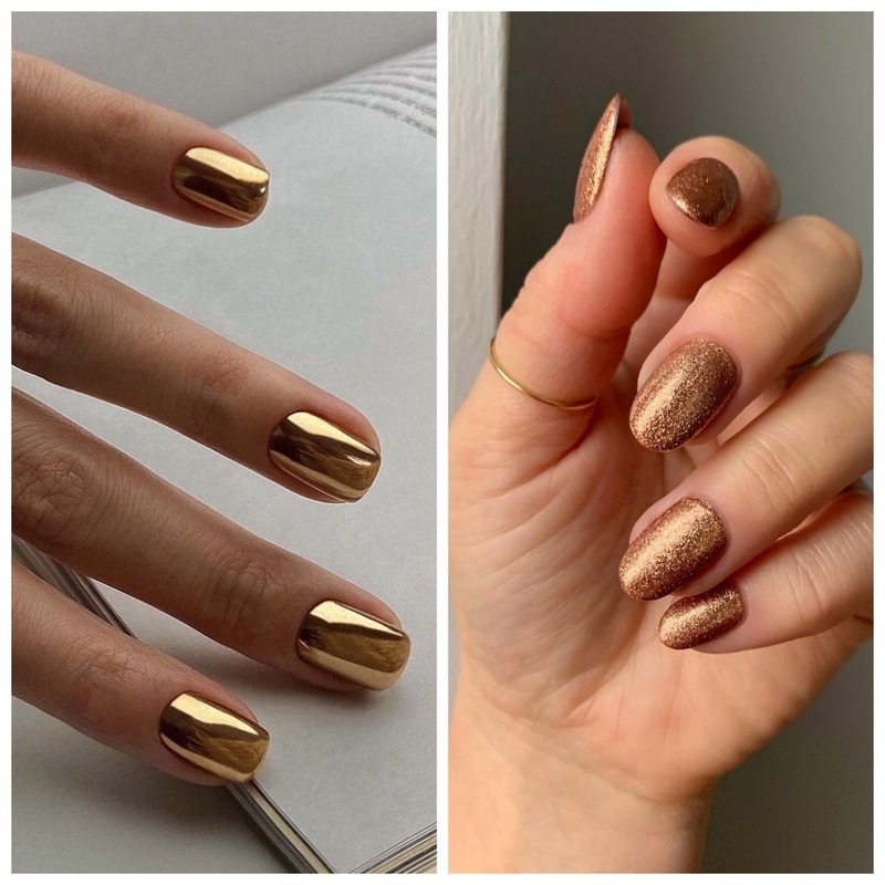 Нет ничего проще чем сделать свои ногти похожими на золотой слиток. Для этого всего лишь нужен глянцевый топ и золотой лак металлик.