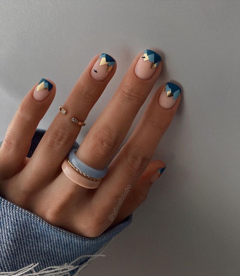 Не только выглядит стильно, но и успокаивает нервы, при этом дарит хорошее настроение. Ведь балом в маникюре правит синий цвет. Создать такой дизайн просто. Смешайте на палитре синий и белый лак, затем нанесите на ногти с помощью губки. Пока слой не высох, приклейте кусочки золотой фольги, покройте ногти топом.