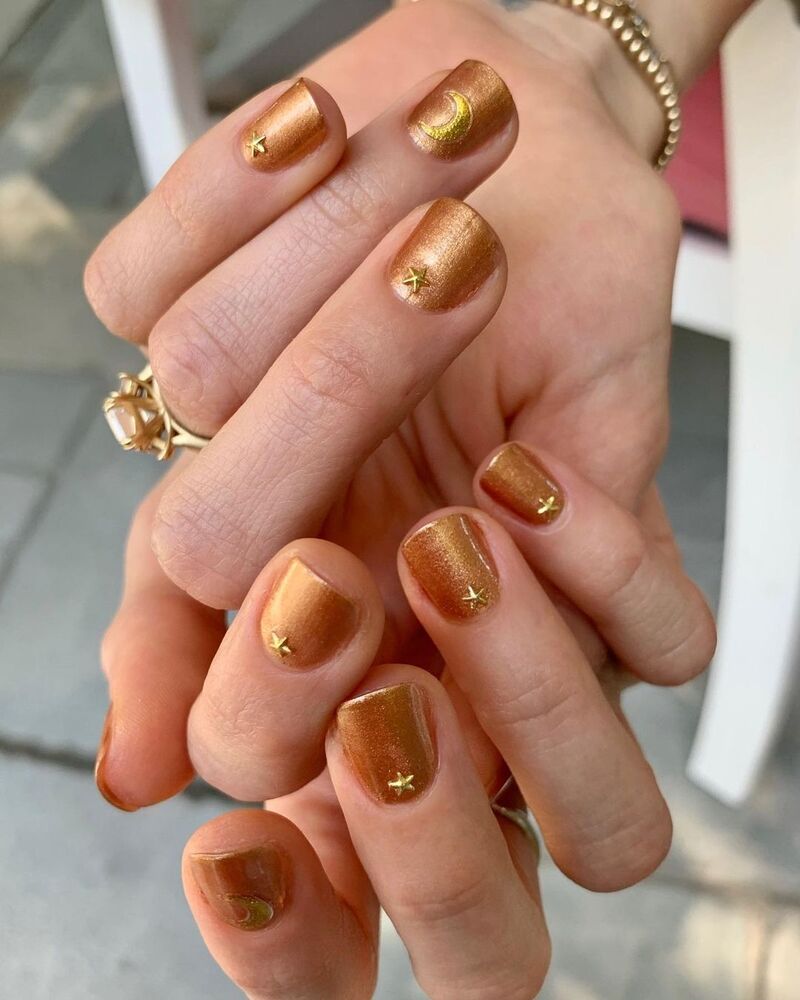 Золотой лак плюс наклейки в виде звездочек или луны дарят новогоднее настроение в маникюре.