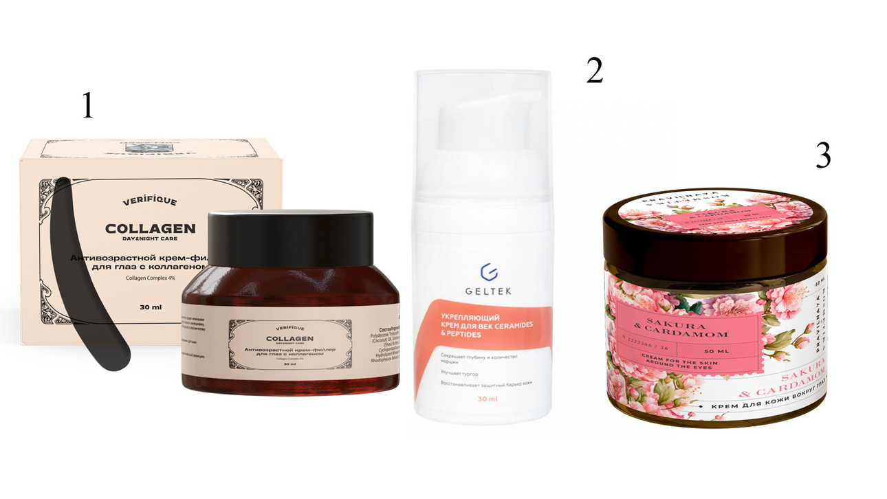 1. Антивозрастной крем-филлер для глаз с коллагеном Verifique. 2. Укрепляющий крем для век ceramides & peptides Geltek. 3. Противоотечный увлажняющий крем для век и кожи вокруг глаз для борьбы с темными кругами и признаками усталости «Сакура & Кардамон» Pravilnaya Kosmetika.