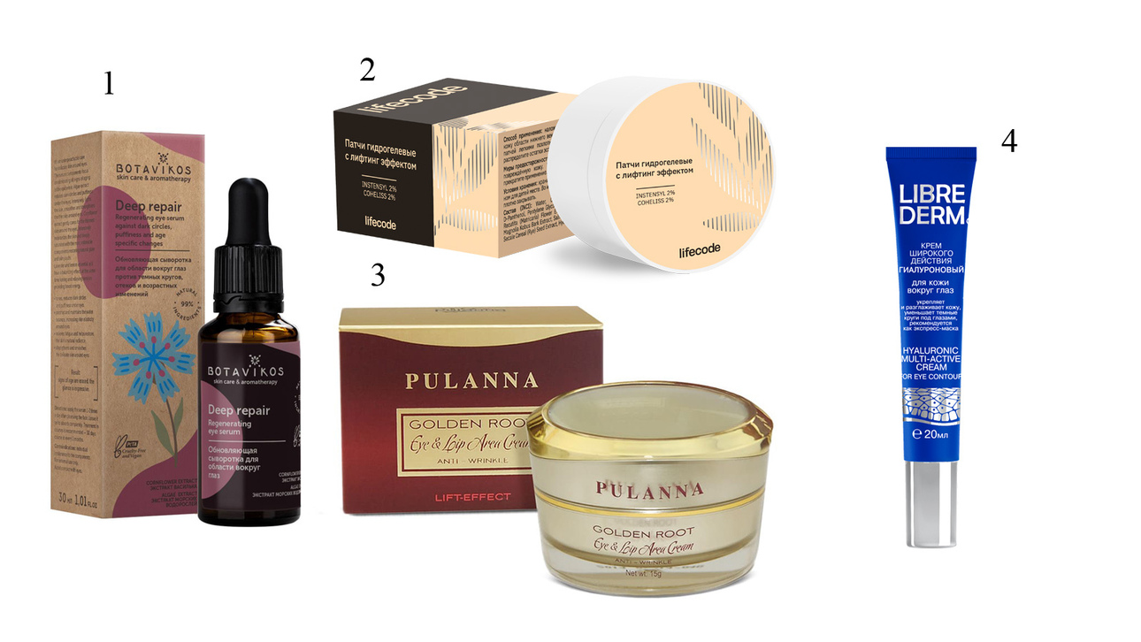 1. Обновляющая сыворотка для области вокруг глаз DEEP REPAIR Botavikos. 2. Гидрогелевые патчи с лифтинг-эффектом Lifecode. 3. Восстанавливающий крем для контура век и губ -Eye & Lip Area Cream Anti-Wrinkle Pulanna. 4. Гиалуроновый крем для кожи вокруг глаз Librederm.