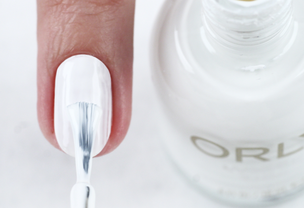 1. На предварительно подготовленные и подпиленные ногти, обработанные дезинфицирующим средством Clean Prep, наносим базовое покрытие Bonder от ORLY. Это обеспечит лучшее сцепление лакового покрытия с ногтевой пластиной, обеспечивая продолжительность «жизни» дизайну. В качестве основного покрытия для ногтей используем белый лак White out. Для более насыщенного цвета наносим его в два слоя.