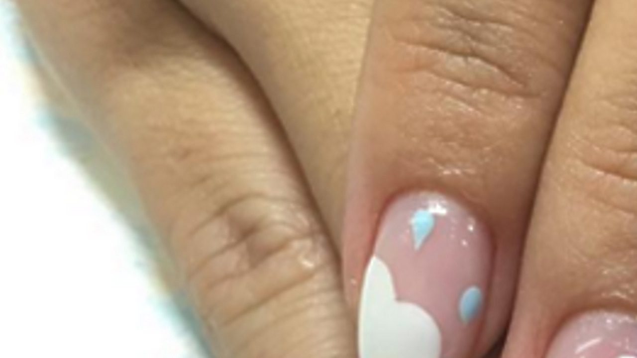 В тренде сейчас маникюр в дождливых тонах: с использованием белого, серого, голубого. Можно полностью окрасить ногти в один из этих цветов или создать сложный интересный дизайн.
