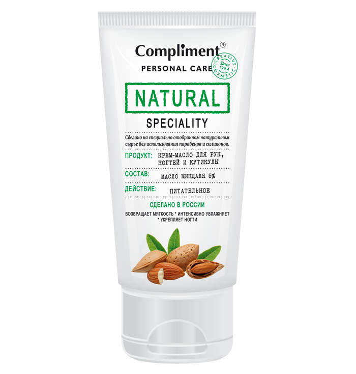 Крем-масло для рук, ногтей и кутикулы NATURAL от Compliment возвращает мягкость чувствительной коже рук, интенсивно увлажняет, а также укрепляет ломкие ногти, предотвращая их расслаивание. В итоге руки дольше сохраняют ухоженный вид после процедуры маникюра.
