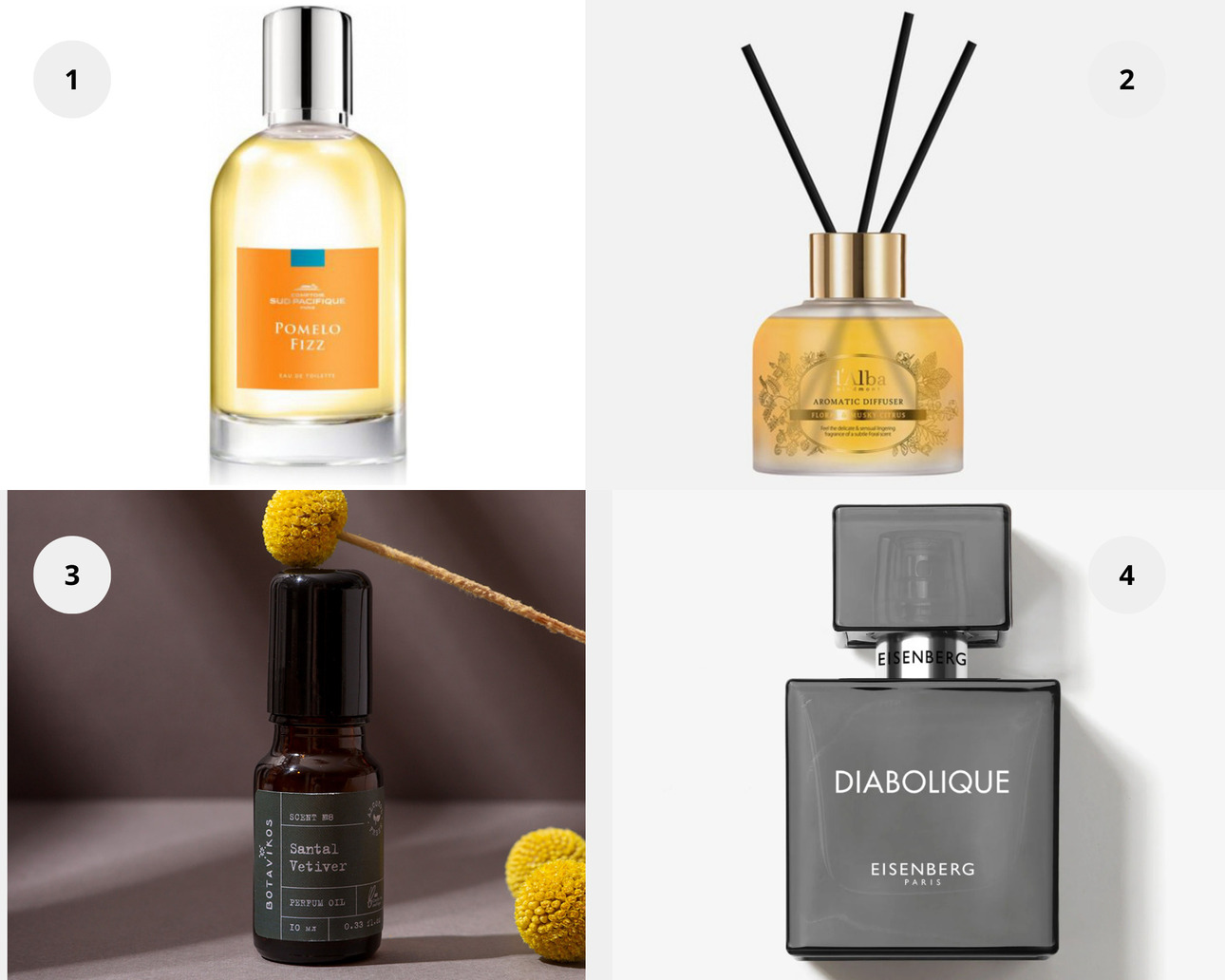 1. Цитрусово-черносмородиновый и древесно-травяной аромат Pomelo Fizz Comptoir, Sud Pacifique. 2. Ароматический диффузор Aromatic Diffuser, d’Alba. 3. Духи на масляной основе (парфюмированное масло) «Сантал-Ветивер», Scent №8, BOTAVIKOS. 4. Парфюмерная вода Diabolique, EISENBERG.