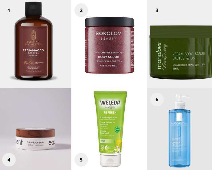 1. Гель-масло для душа Oil-in-gel «Увлажнение и питание», Русская косметика. 2. Скраб для тела DARK CHERRY & ALMOND, SOKOLOV BEAUTY. 3. Увлажняющий скраб для тела Vegan Cactus & B5, 250 мл, monolove. 4. Парфюмированный крем для тела Drunk Cherry, Equivalent. 5. Гель для душа Refresh, Weleda. 6. Успокаивающий гель для душа с защитными свойствами Lipikar Lavant, La Roche-Posay.
