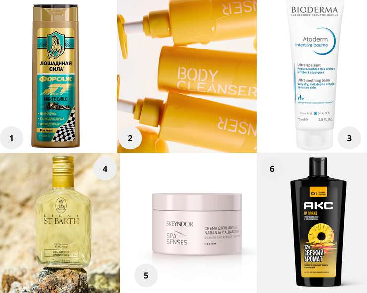 1. Шампунь-гель для душа дезодорирующий 3в1 «Формула Форсаж Монте-Карло», Лошадиная сила. 2. Нежное гель-масло для душа, Don’t Touch My Skin. 3. Бальзам Интенсив Atoderm, Bioderma. 4. Гель для душа с ветивером и лавандой, ST BARTH. 5. Скраб с апельсином и абрикосовой косточкой для тела SPA Senses, Skeyndor. 6. Гель для душа, умывания и шампунь Акс На пляже 3 в 1, Акс.