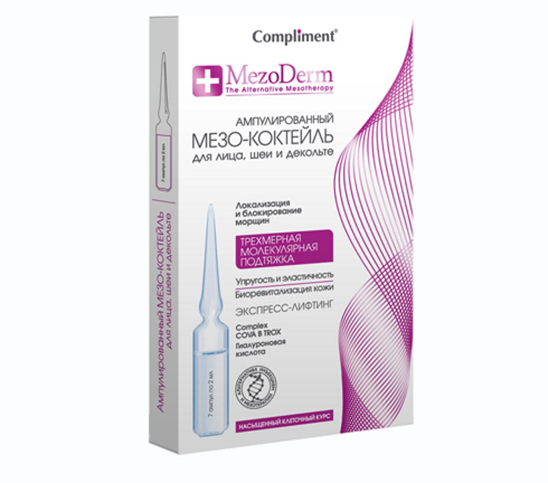 Ампулированный мезо-коктейль MezoDerm для лица, шеи и декольте от Compliment содержит комплекс COVA B TROX из активного морского магния, экстракта водорослей, полисахаридов, корня цикория и мальтозы. Молекулы COVA B TROX очень маленького размера и обладают максимальной способностью к диффузии. Благодаря своему размеру они свободно проникают в кожу. В косметологии этот комплекс позволяет избежать инъекций и, соответственно, побочных эффектов.