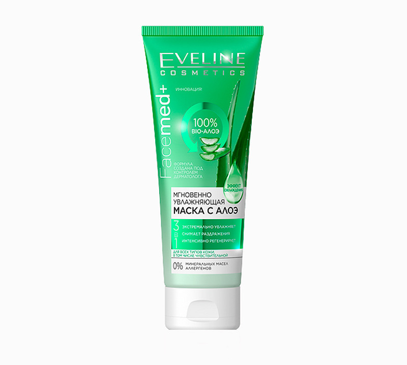 Мгновенно увлажняющая маска с алоэ от EVELINE cosmetics имеет в своем составе, помимо алоэ, еще и гиалуроновую кислоту, а также витамины A+E. Проникая в глубокие слои эпидермиса, они увлажняют его, восстанавливая оптимальный гидролипидный баланс, насыщают витаминами и полезными микроэлементами, смягчают, разглаживают, повышают упругость, укрепляют. За счет антибактериальных и успокаивающих свойств они устраняют покраснения и воспаления, а благодаря тонизирующему действию — улучшают цвет лица.