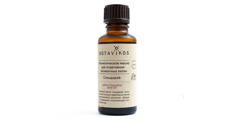 Рекомендуем: косметическое масло для осветления пигментных пятен «Сельдерей» от Botavikos. Входящее в состав этого средства эфирное масло сельдерея справедливо считается одним из самых лучших в борьбе с пигментными пятнами — оно отлично осветляет, способствует регенерации, выравнивает тон кожи. Масла подсолнечника и ореха макадамии возвращают эластичность, укрепляют эпидермальный барьер. Для достижения максимального эффекта рекомендуется ежедневно наносить масло на очищенную кожу лица легкими массажными движениями.