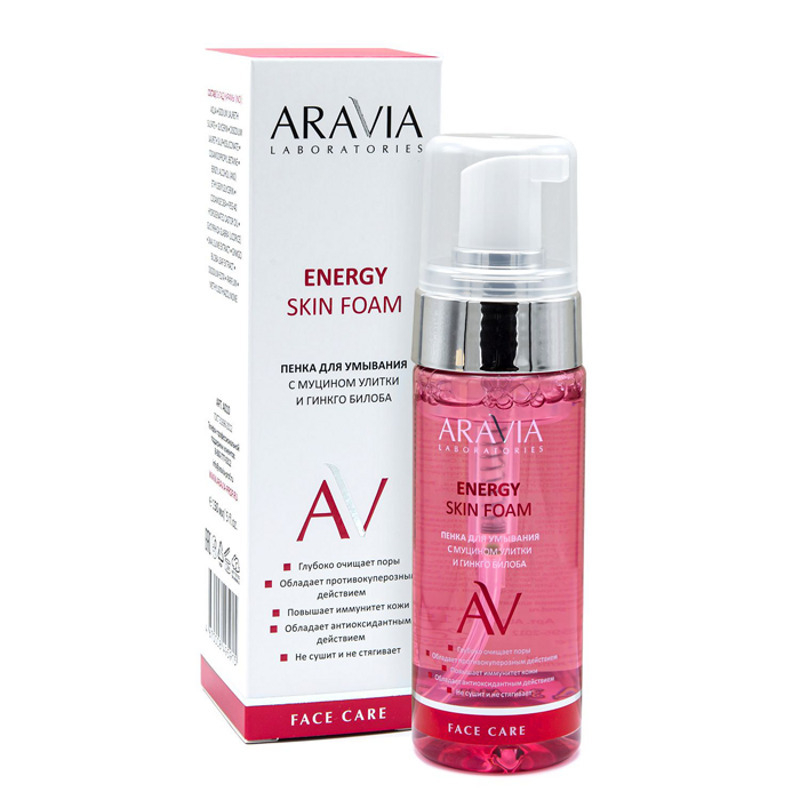 Пенка для умывания с муцином улитки и гинкго билоба Energy Skin Foam от ARAVIA Laboratories очищает кожу нежно, но без того скрипа, который присущ гелям. Особая формула увлажняет, смягчает и освежает кожу, обеспечивая чувство чистоты и комфорта, а ароматная пена с цветочными нотками позаботится о тонусе кожи. Эта пенка содержит муцин улитки — прекрасный антиоксидант, который замедляет процессы старения, способствует регенерации кожи, обладая отшелушивающим действием.