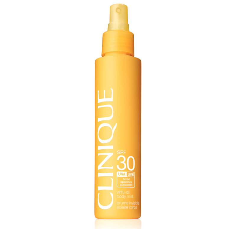 Практика. Специалисты настоятельно рекомендуют использовать солнцезащитные средства. Новое, протестированное дерматологами невесомое солнцезащитное средство Clinique SPF 30 Clinique Virtu-Oil Body Mist обладает роскошной текстурой сухого масла для тела и обеспечивает необходимую защиту от солнца. Великолепная жидкая формула без содержания масел нейтрализует воздействие ультрафиолетовых лучей групп A и B в соотношении 3:1, мгновенно впитывается и дарит приятную прохладу без ощущения липкости. Удобный флакон обеспечивает аккуратное и быстрое распыление средства даже на самые труднодоступные участки кожи. Спрей можно использовать в перевернутом состоянии!