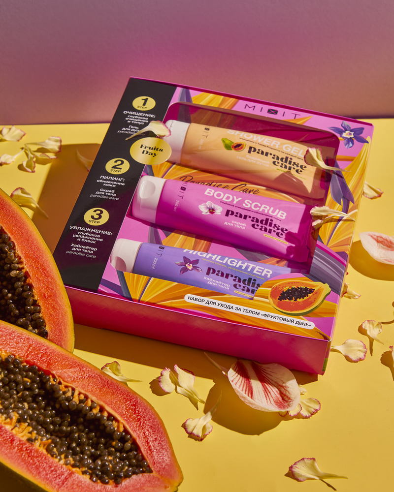 В преддверии новогодних праздников бренд MIXIT выпустил сразу 12 наборов, которые помогут подготовиться к празднику и подарят идеальный уход за телом в зимний период. Мы в бьюти-отделе влюбились в набор «Фруктовый день», который включает в себя три продукта для ухода за телом: бодрящий гель для душа с экстрактом папайи, скраб для тела и хайлайтер с цветочными экстрактами. Это тот минимум, которого достаточно, чтобы чувствовать себя комфортно и выглядеть роскошно каждый день. А нежный аромат перенесет в настоящий райский сад.