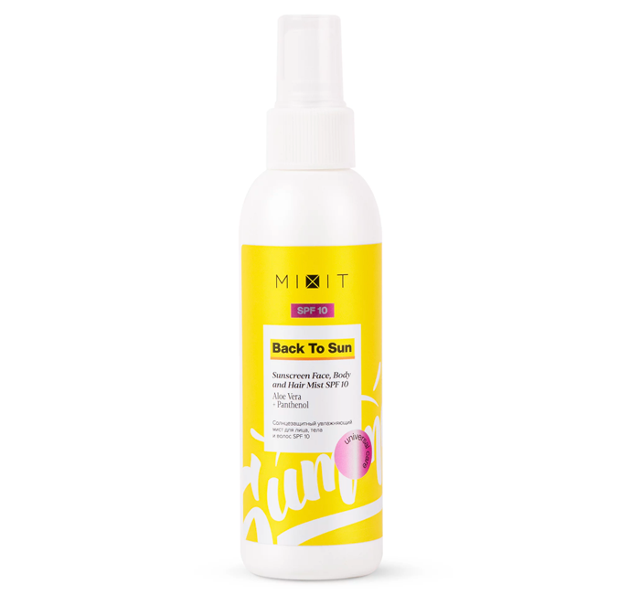 Попробуйте для начала средства, которые разработаны сразу для лица, тела и волос. Например, Солнцезащитный увлажняющий мист для лица, тела и волос Back To Sun Sunscreen Hydrating Face, Body and Hair Mist SPF 10 от MIXIT одинаково хорошо будет чувствовать себя как на коже, так и на волосах. Перед использованием просто встряхните флакон и распылите мист на расстоянии 15—20 см на лицо, тело или волосы. Рекомендуется наносить за 15—20 минут до выхода на солнце.