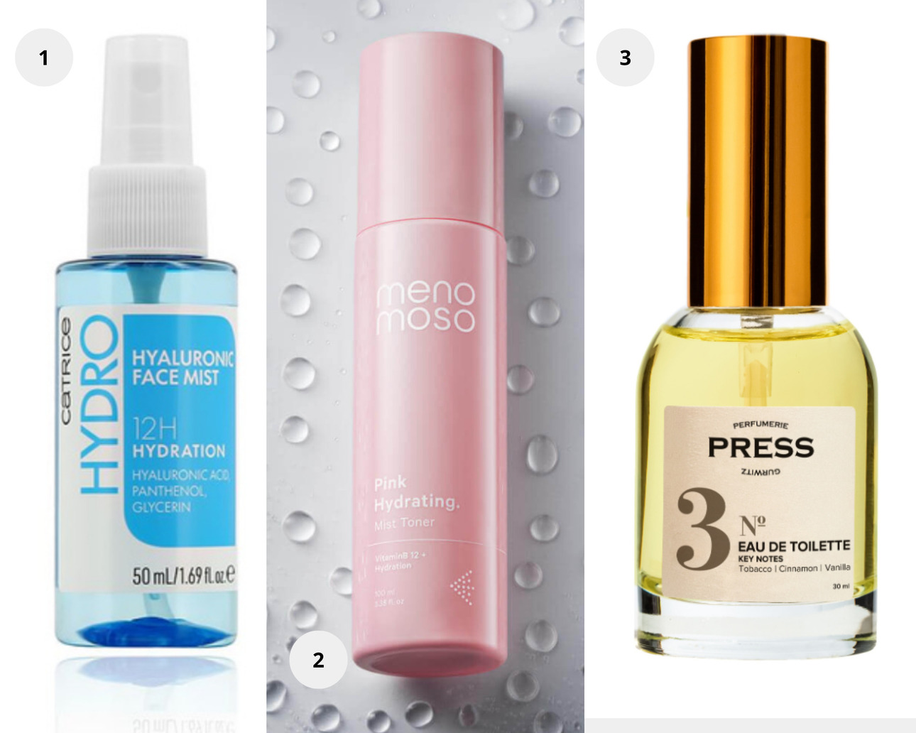 1. Мист для лица Catrice Hydro Hyaluronic Face Mist. 2. MENOMOSO Тонер-мист с гиалуроновой кислотой для сияния кожи. 3. Легкая туалетная вода №3 Press Gurwitz Perfumerie c нотами табака, корицы и ванили.