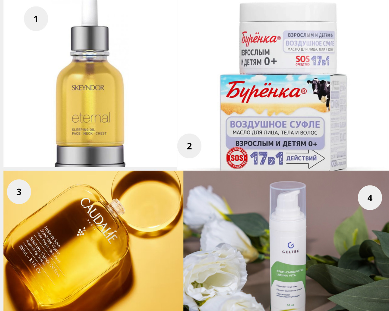 1. Ночное масло с маслом жасмина антивозрастное от Skeyndor Eternal. 2. Буренка Масло-суфле для лица, тела и волос. 3. Сухое масло для тела Soleil des vignes Caudalie. 4. Geltek Крем-сыворотка Lumina vita.