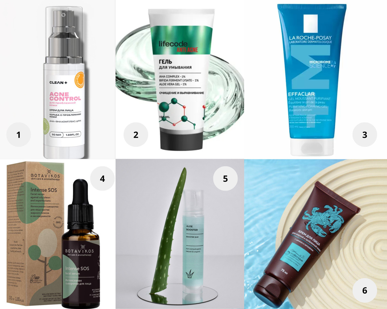 1. Крем для лица, от акне и постакне, Clean+. 2. Гель для умывания Anti Acne, Lifecode. 3. Реновация Очищающий пенящийся гель для чувствительной жирной кожи лица и тела EFFACLAR, La Roche-Posay. 4. Интенсивная сыворотка против жирного блеска и несовершенств INTENSE S. O. S., Botavikos 5. Бустер-сыворотка с органическим алоэ и полиглутаминовой кислотой, ALOE BOOSTER, Booster Bar. 6. Крем для жирной и проблемной кожи с цинком и хитозаном, HydroBionique.