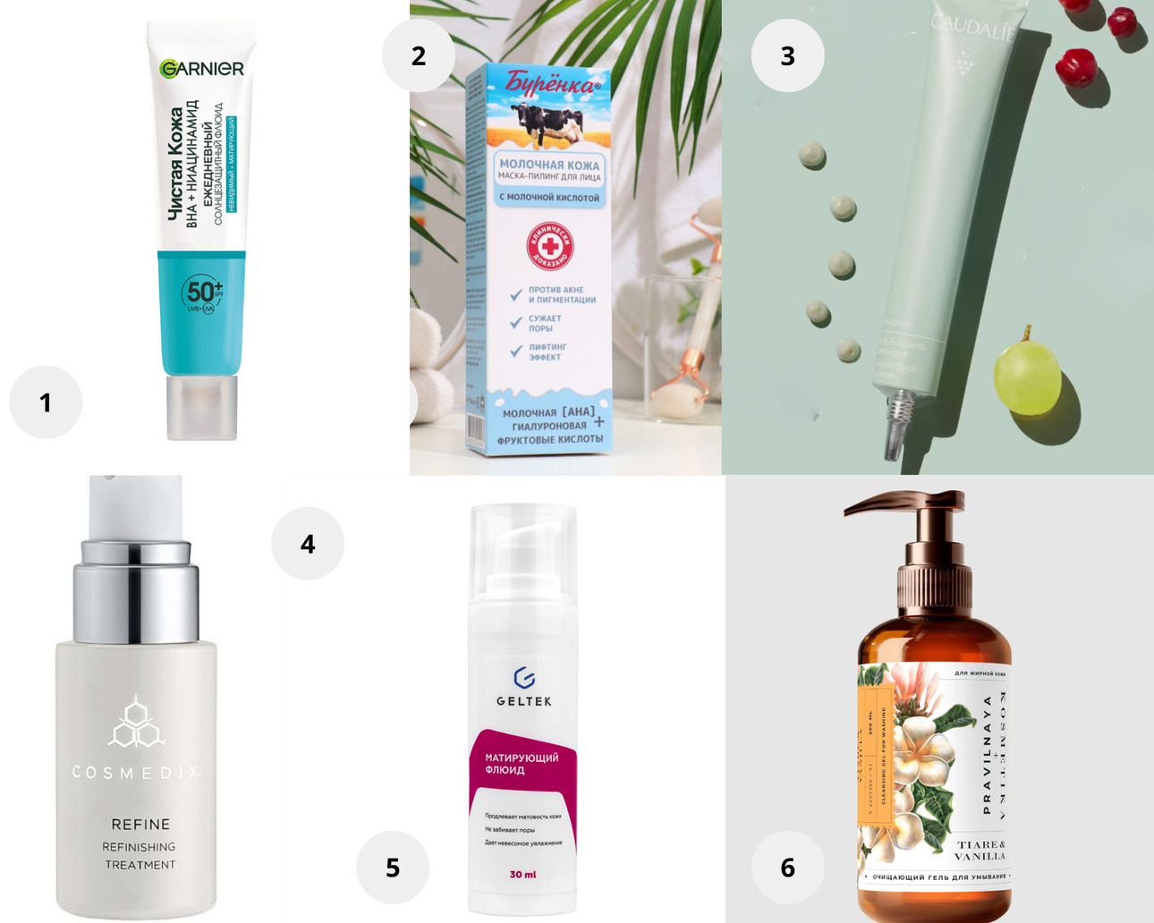 1. Флюид для лица с ниацинамидом Чистая кожа, Garnier. 2. Маска-пилинг молочная для лица с молочной и гиалуроновой кислотами, Буренка. 3. Точечное средство против несовершенств кожи Vinopure, Caudalie. 4. Сыворотка ремоделирующая с 0,5% ретинолом REFINE, Cosmedix. 5. Матирующий флюид, Geltek. 6. Очищающий гель для умывания жирной и проблемной кожи лица, против акне и воспалений, успокаивающий, Тиаре & Ваниль, Pravilnaya Kosmetika.