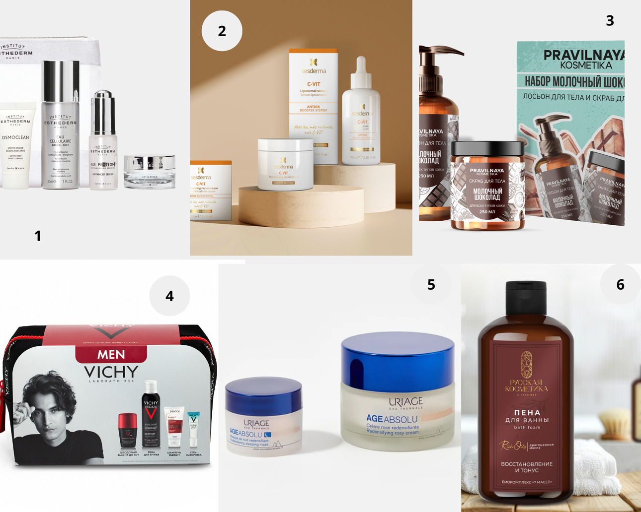 1. Подарочный набор Institut Esthederm. 2. Подарочный набор бестселлеров уходовых продуктов Sesderma — липосомальной сыворотки и увлажняющего крема C-VIT. 3. Pravilnaya Kosmetika Подарочный набор для тела парфюмированный скраб и лосьон «Молочный шоколад». 4. Подарочный набор Vichy.. 5. Урьяж Набор для ухода за кожей лица Эйдж Абсолю. 6. Пена для ванны «Восстановление и тонус», Русская Косметика.