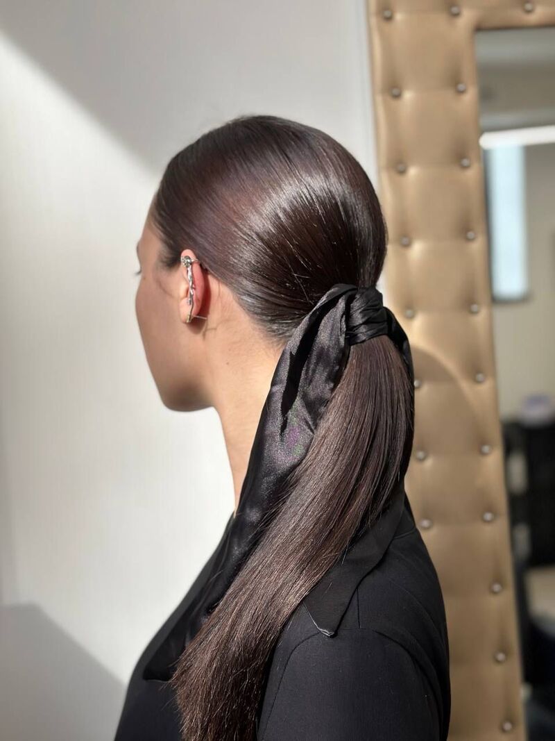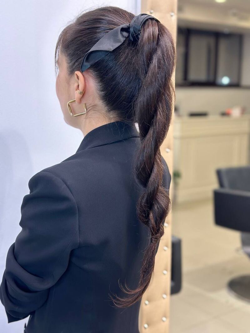 Это точно ваш вариант, если волосы ниже плеч. Для создания образа нужно сделать хвост выше обычного и разделить его на две части. Одну из прядок нужно будет обернуть вокруг пальца и закрутить по часовой стрелке до самого низа. «Так получится создать эффект жгута, как на фото. Это выглядит эффектно и интересно», — говорит стилист. То же самое сделайте со второй прядью. После этого просто переплетите пряди между собой и также повяжите атласную ленту на основании хвоста.