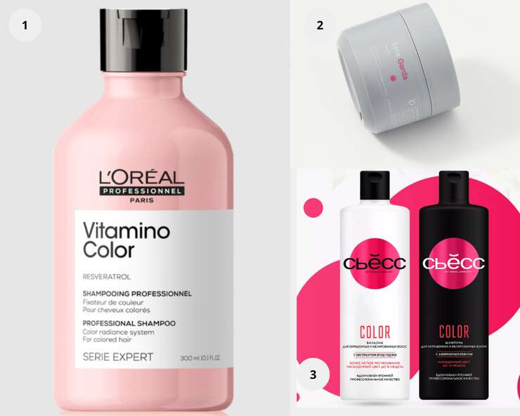 1. L’Oreal Professionnel Paris Шампунь VITAMINO COLOR Для защиты цвета. 2. Маска для осветленных, обесцвеченных и мелированных волос GARDA, Impression Professional. 3. Сьёсс Color Шампунь + Бальзам.
