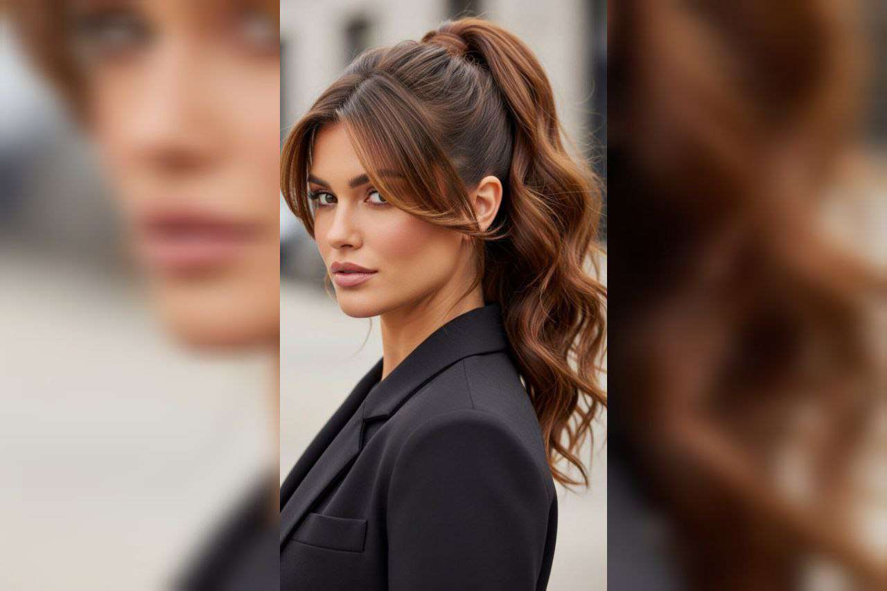 Кажется, что праздничного в обычном хвосте? Ну тут как на него посмотреть и как выполнить. Чтобы прическа выглядела объемной, начешите корни — это придаст локонам дополнительную густоту. Перед укладкой не забудьте нанести термозащиту, а для работы с волосами используйте расчески разного типа: тонкой разглаживайте гладкие пряди, а круглой придавайте объем, если хотите пышный хвост. Для новогоднего сияния можно слегка обработать волосы лаком с блестками без крупных частиц. Завершите образ шелковой лентой или стильной резинкой. Если предпочитаете минимализм, просто оберните хвост тонкой черной резинкой и спрячьте ее прядью.