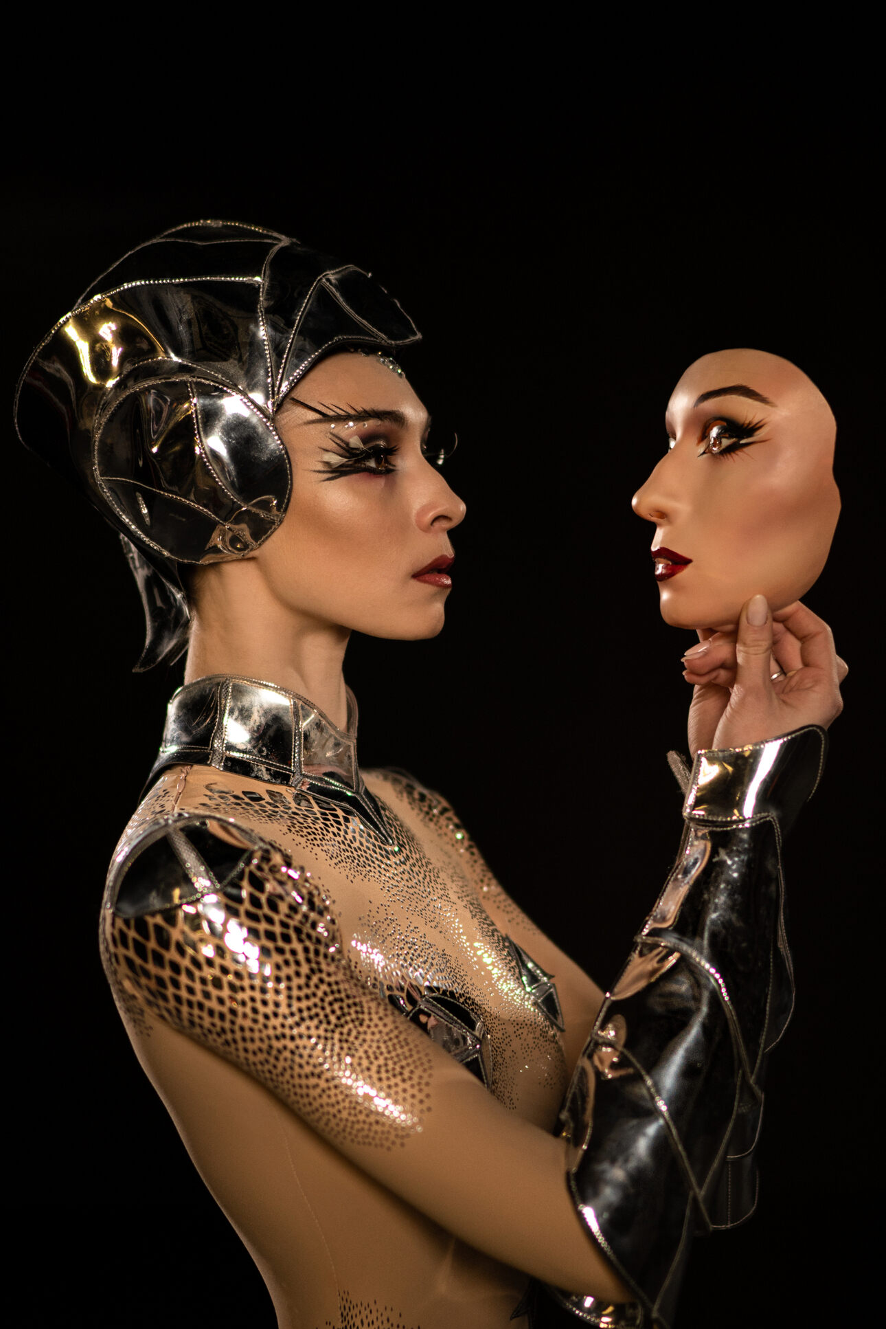 Так вот, Тьерри Мюглер в коллаборации со знаменитым хореографом Уэйном Макгрегором создали дуэт специально для Ольги Смирновой (ее партнером станет премьер Большого театра Денис Савин). Мюглер в этой работе возвращается к любимой теме женоподобного андроида, подарив танцорам рептилоидную кожу, лица-маски и гривы-ирокезы и облачив в зеркально-сияющие латы киборгов.