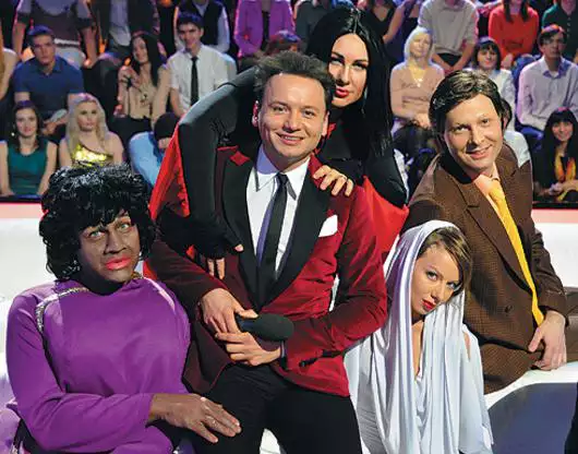 — К номеру Эллы Фицджеральд я готовился не хуже, чем ко всем остальным. Репетировал с нашим педагогом по вокалу, которая объяснила мне некоторые тонкости. Но еще утром, на репетиции, у меня было провальное ощущение, что номер не получится: получалось совершенно не интересно и не смешно. А вот когда на меня «взгромоздили» весь этот грим и костюм, то сразу изменились и пластика, и выражение лица! Кстати, на грим у меня ушло три с половиной часа, и потом еще полтора часа его снимали. А поскольку меня всего покрывали краской, то следы от нее на руках и ногтях я носил еще дня четыре — она не смывалась ничем. (Смеется.) Вообще, на мой взгляд, это, конечно, в первую очередь шоу гримеров. Они здесь — настоящие герои. По крайней мере в моем случае это точно так. Я не сильный актер-пародист и не обладаю таким талантом, как Тимур Родригез или Леша Чумаков, который показывает фантастическую работу в этом жанре. Хотя у нас и не стоит задачи изобразить звезду в комическом или сатирическом ключе — мы ни в коем случае не делаем ничего злого. Но если номер вызывает улыбку или смех, он всегда доставляет больше радости людям. А когда тебе публика аплодирует — это очень приятно.