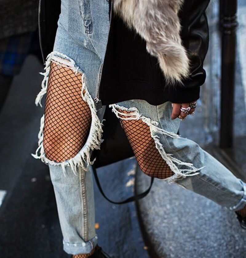 Помните в моде были модели джинсов из-под которых торчали колготки в сеточку. Кажется будто они созданы друг для друга. С рваными джинсами сеточка выглядят словно вставки в перфорации. Вариант колготок универсальный. В сочетании с джинсами и парвильным верхом можно составить любой образ — об бутарского до романтичного или даже делового.