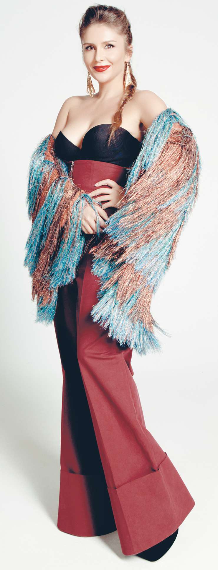 Бахрома — яркий отделочный элемент, привлекающий к себе внимание, актуальный тренд сезона. В динамике восторг вызывают равномерные волнообразные колебания, а в статике — оригинальность оформления элементов одежды. Именно яркость декора накладывает стилистические ограничения на весь look, требуя лаконичности и минимализма в остальном наряде. Мы выбрали черное бюстье, открывающее грудь и плечи, дабы соблюсти баланс с громоздким жакетом, и широкие вишневые брюки с высокой талией, визуально удлиняющие ноги. Чтобы добавить образу немного диско, надели золотые серьги из металлической ткани.