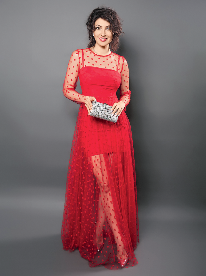Это платье модного оттенка томатов черри, приталенное, двухслойное, с прозрачным сетчатым верхом в горох является хитом сезона и прекрасно подойдет для выхода в свет. Вечерний серебристый клатч со стеклярусом идеально дополнит образ.