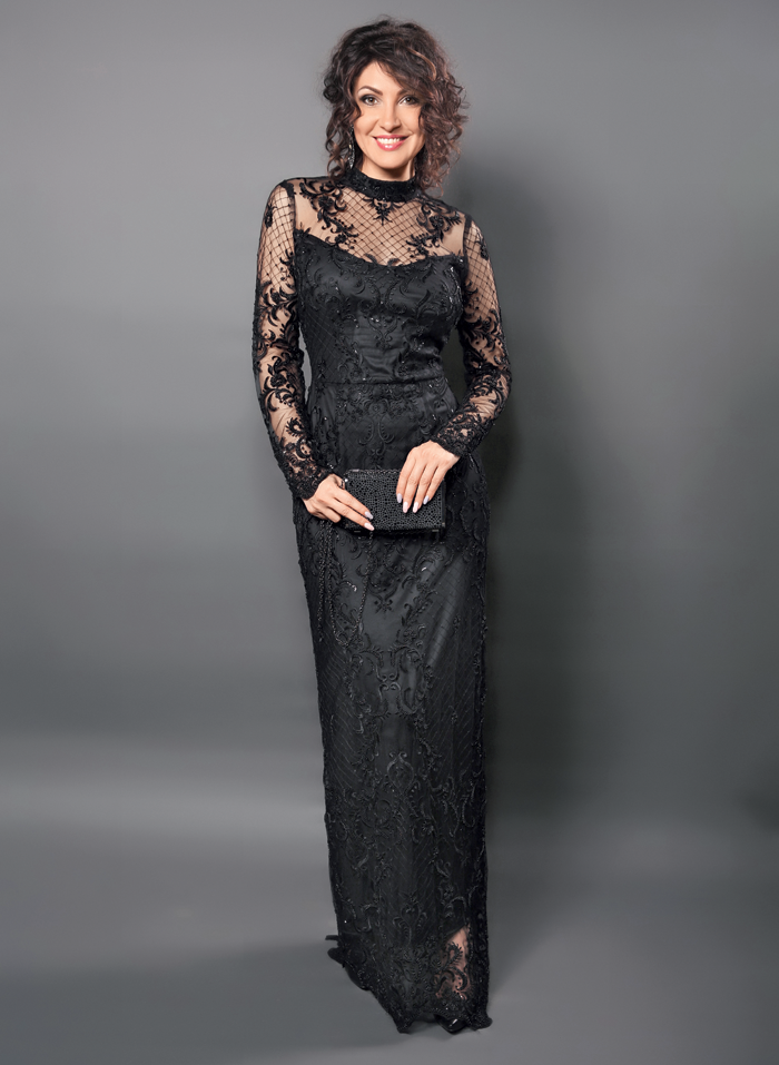 Кружевное платье-футляр классического черного цвета, полностью расшитое бисером и пайетками, прекрасно подчеркивает фигуру и выглядит невероятно роскошно. Образ дополнил черный клатч прямо-угольной формы со стеклярусом.